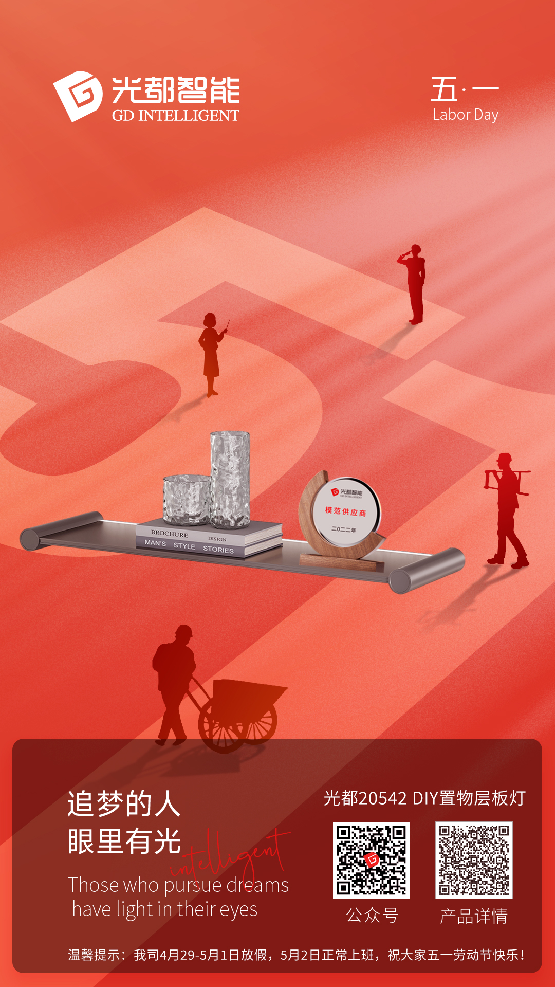 温馨提示:我司4月29-5月1日休假,5月2日正常上班,祝大家五一劳动节快乐!光都新品20542 DIY置物层板灯致敬劳动,五月优费上样!